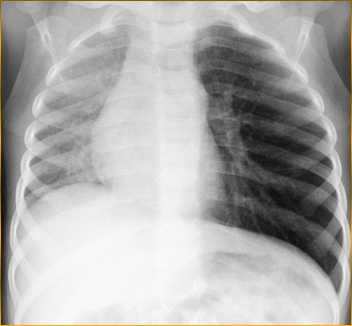 Si vede chiaramente la mancata espulsione dell'aria dal campo polmonare a sinistra per occlusione bronchiale
